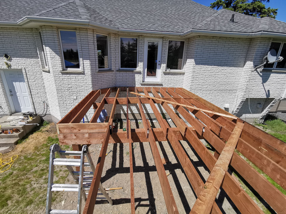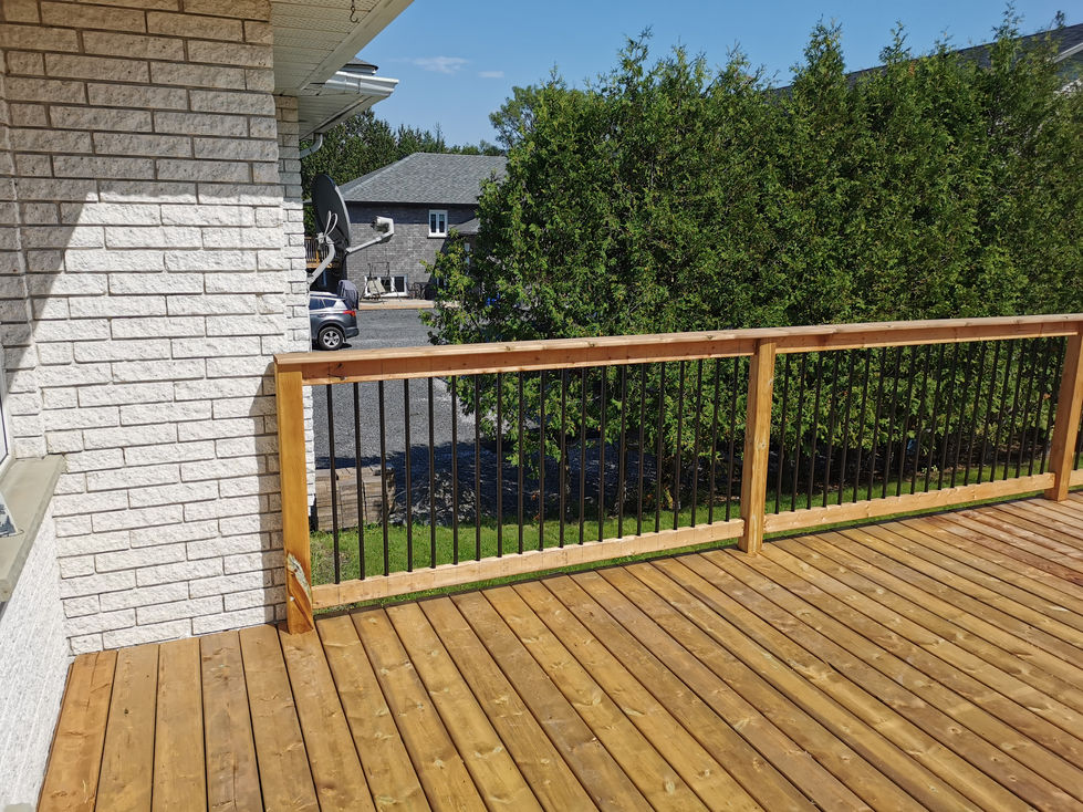 A beautiful deck to create living space at the elevated door on the back side of this residence.
